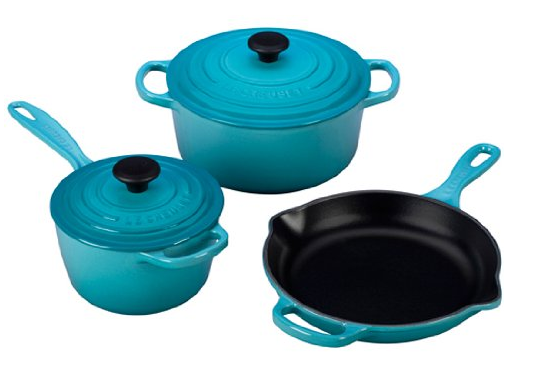 #2. Le Creuset Caribbean Blue Cast Iron Cookware Set